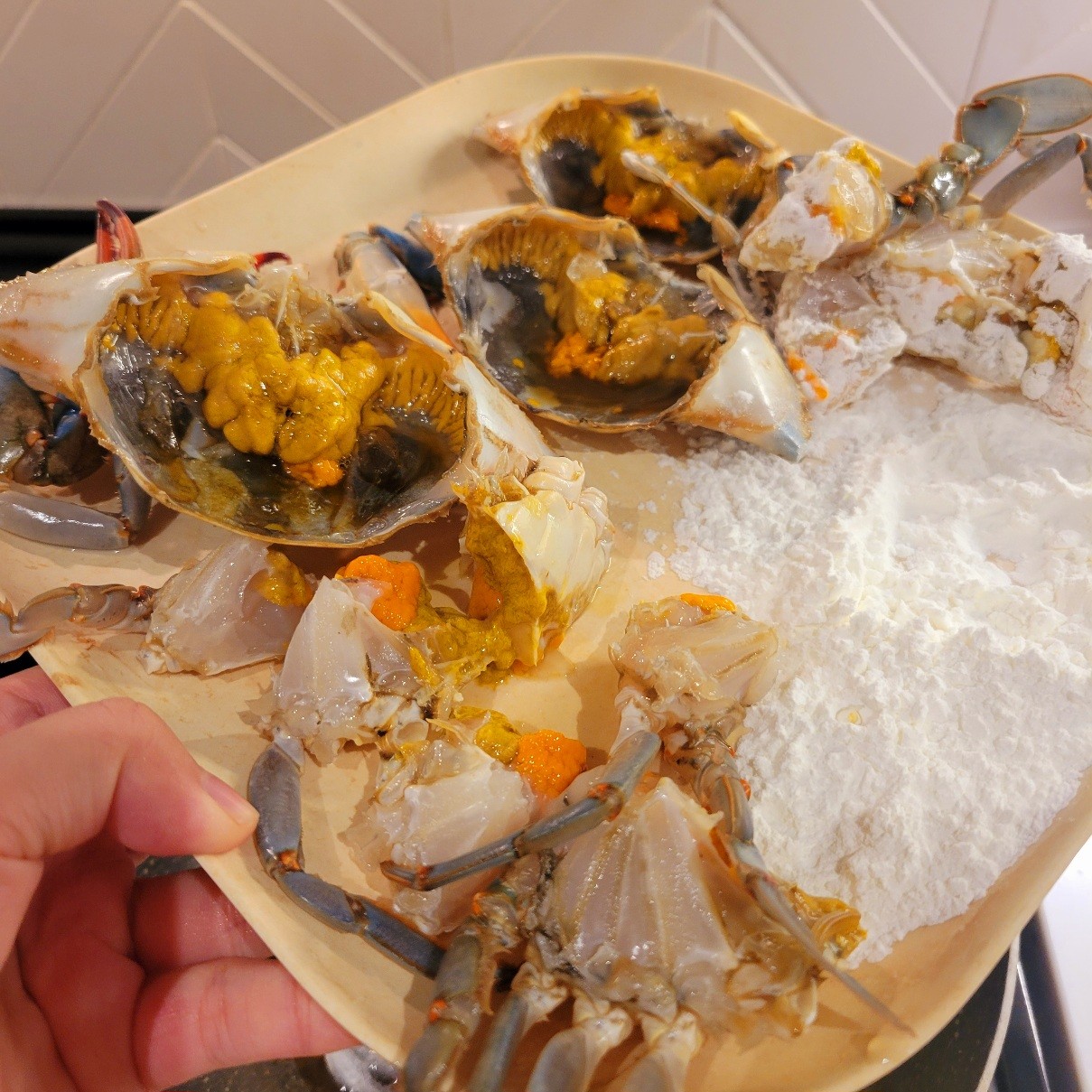 1.螃蟹处理切分,钳敲碎,盖撒粉,切口沾淀粉
