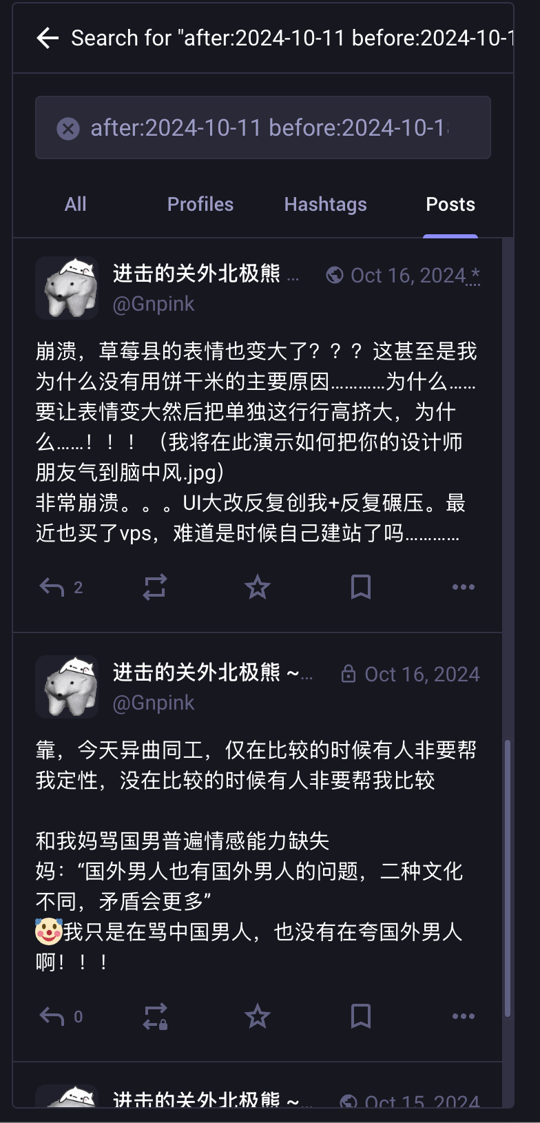 如果想要不同时间段的(比如精准的去年今日这一天),拿去让AI改一下就行了。不过受限于毛象的功能,没法做到能滚动查看同期上下的嘟嘟。