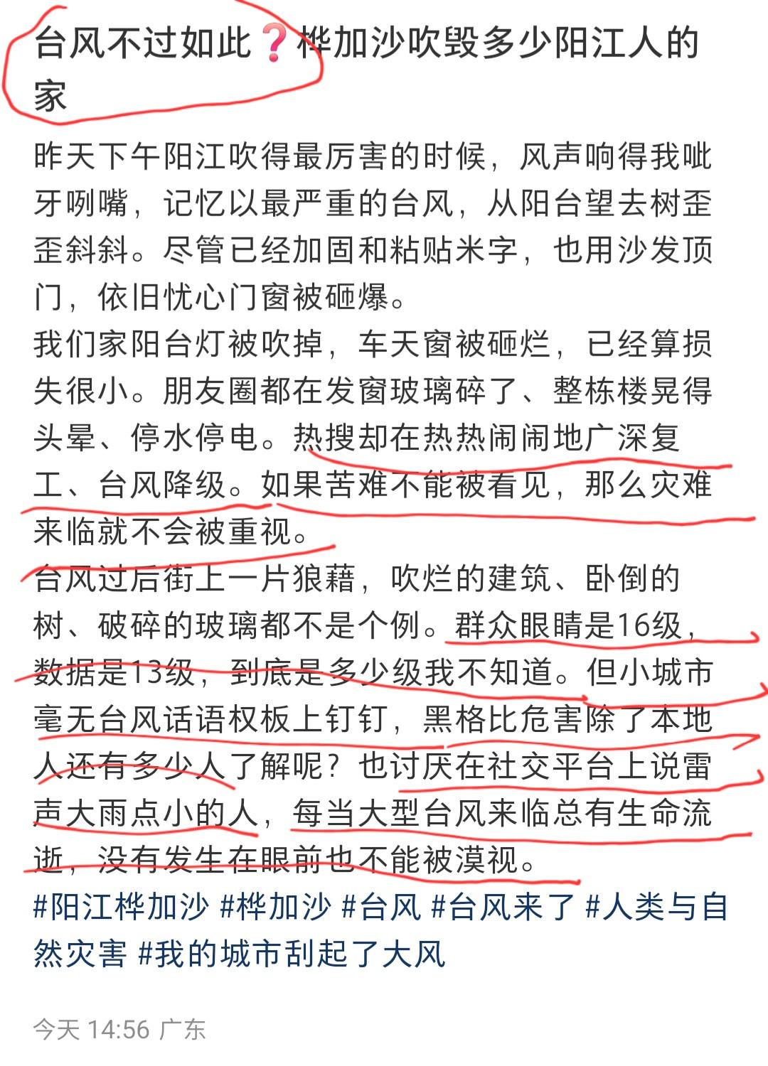 這位小紅書人句句切中要害,廣深港澳的話語權大,大家也只把注意力放在這些明星城市身上,陽江在輿論場裡是小透明、卻扛下了所有衝擊,不止陽江,台風眼周圍100公里內的茂名、江門和上下川島也是如此。