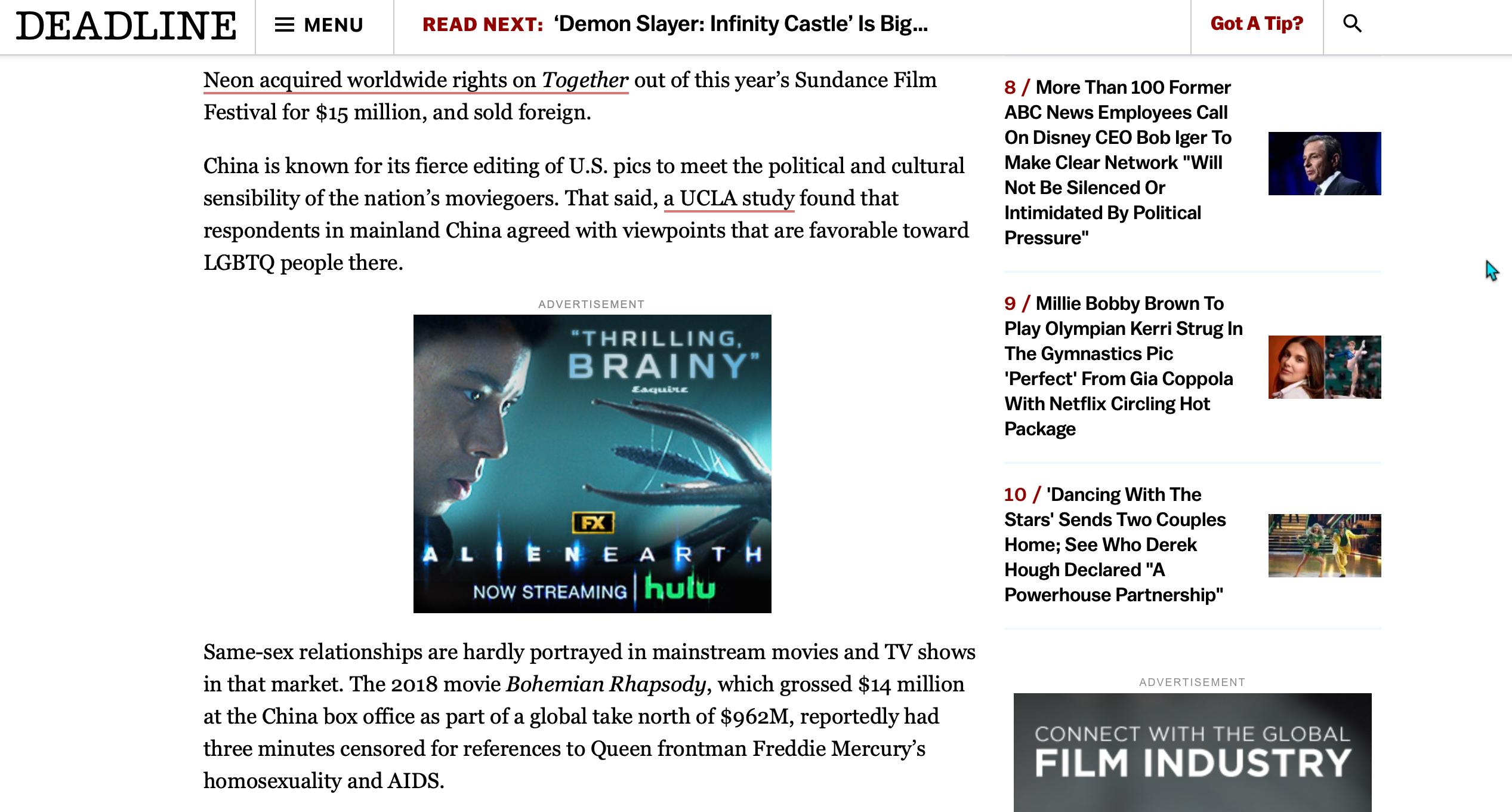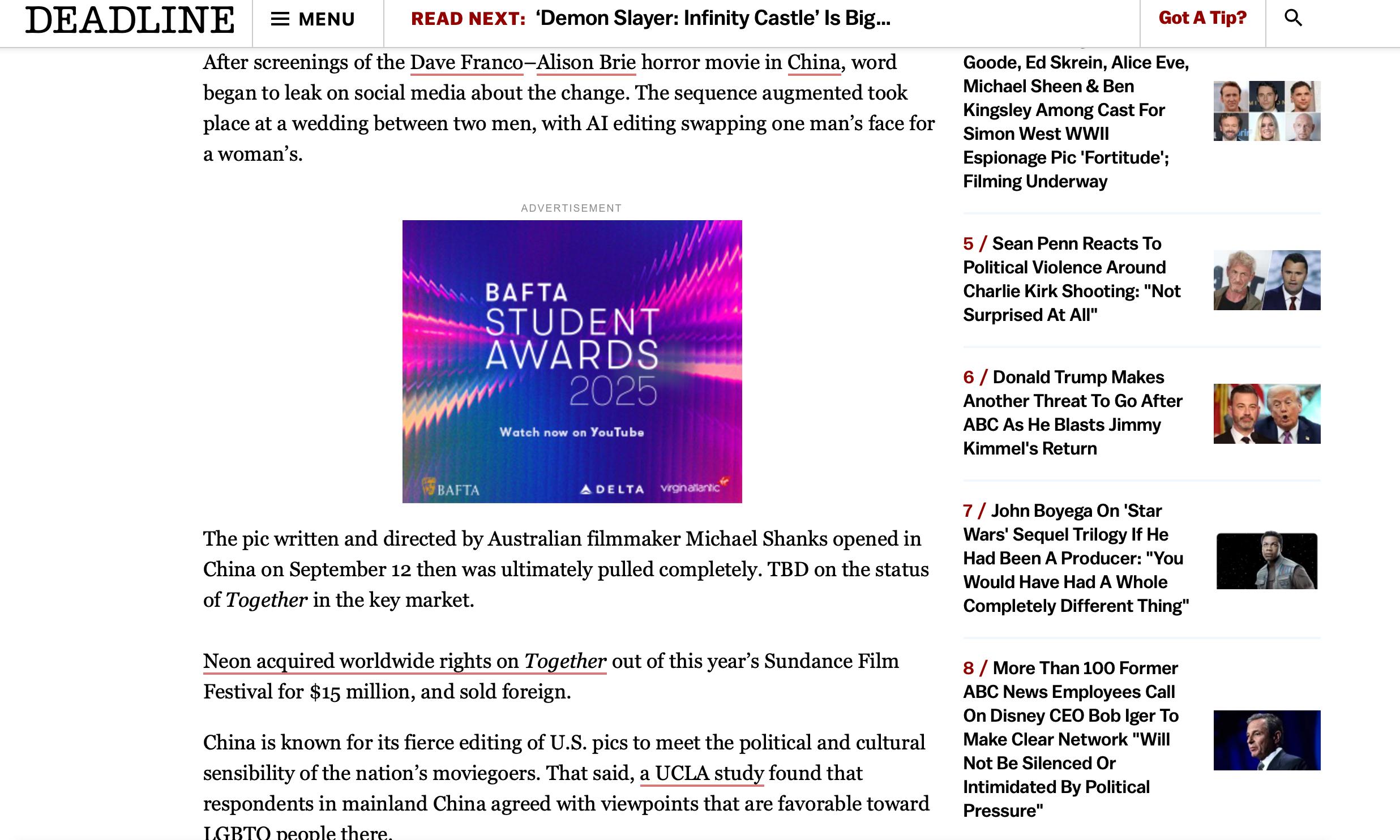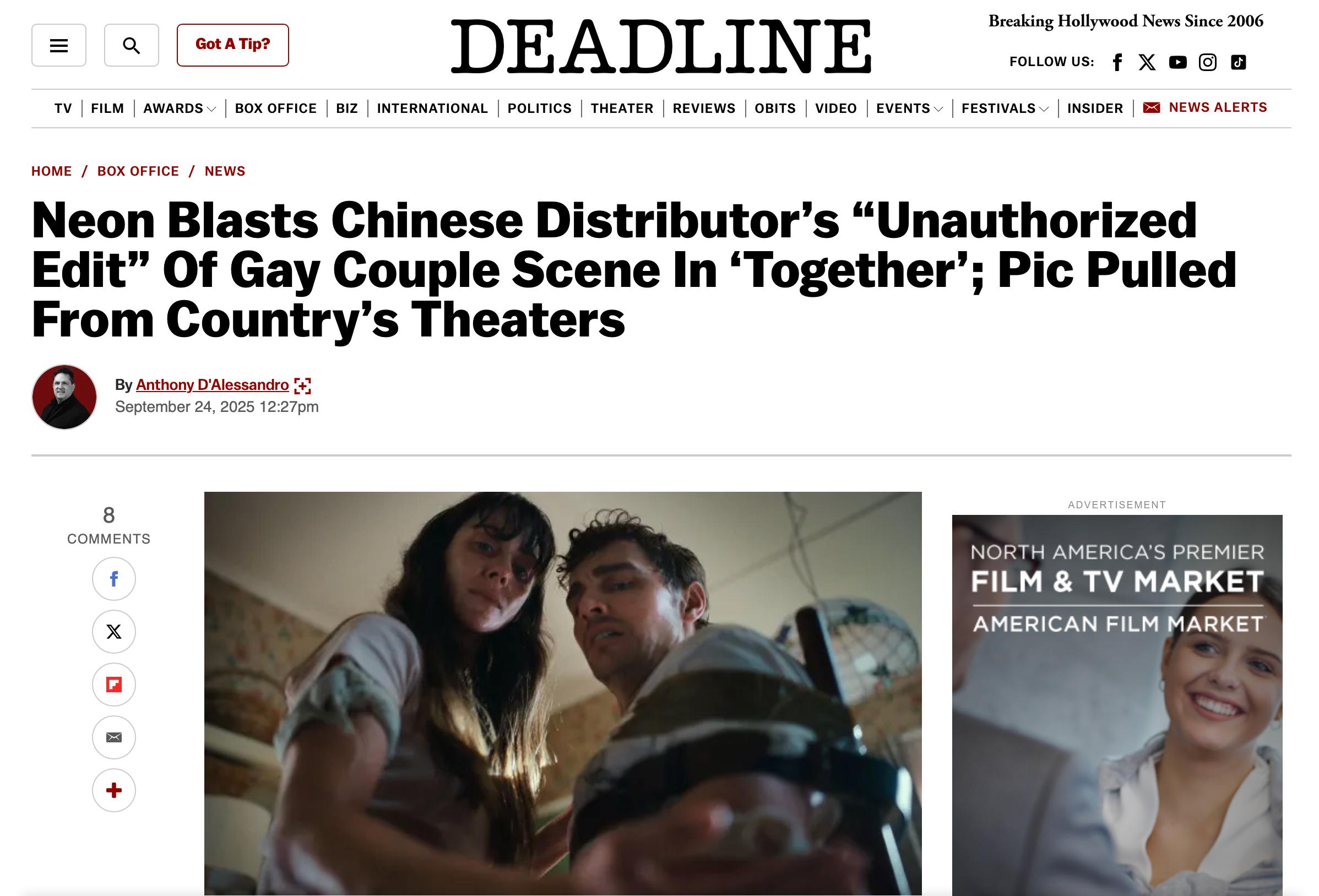 #同甘共苦撤档 Deadline报道了《同甘共苦》在中国大陆的使用AI改换同性情侣人物性别的事件,《同甘共苦》的发行商NEON并未授权海映的此类编辑行为,并已经要求停止发行这一版本